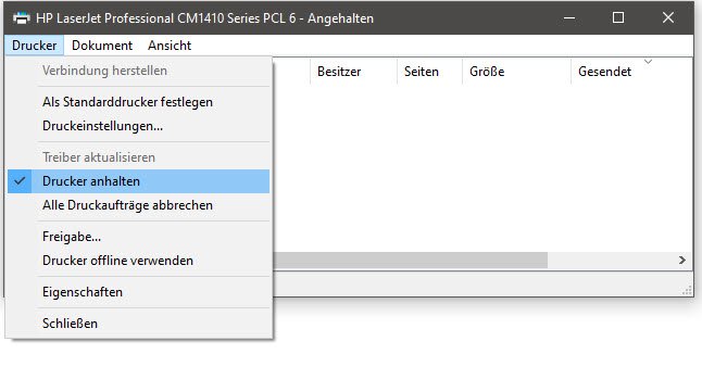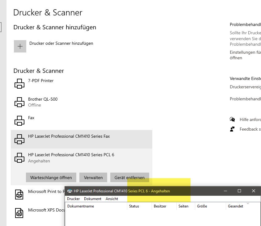 Der banale Tipp, das System einfach neu zu starten und den Druck erneut zu versuchen, führt erstaunlich oft zum Erfolg. Wenig freier Arbeitsspeicher und nicht abgeschlossene Druckaufträge sind häufig Ursachen, dass komplexere, größere Dokumente nicht oder nicht vollständig gedruckt werden können. Prüfen Sie auch, ob der Drucker „online“ ist und nicht angehalten wurde. Dies können Sie in Windows 10 über die Einstellungen -> Geräte -> Drucker und Scanner prüfen, indem Sie die Warteschlange von dem Drucker öffnen. In der Fensterzeile sehen Sie dann, ob der Drucker angehalten wurde.