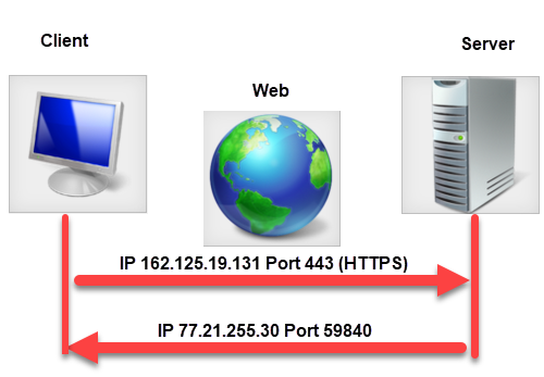 Wenn ein Webbrowser per https auf eine Webseite zugreift, ruft er über einen zufälligen User-Port die IP-Adresse des Zielservers auf dem Port 443 für HTTPS auf.