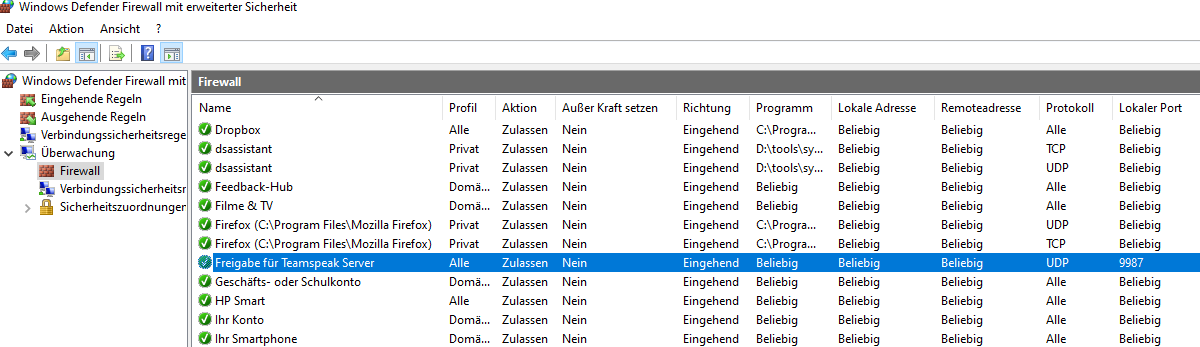 Die fertige Portfreigabe finden Sie dann wieder unter „Firewall“. Wie man in dem Screenshot erkennt, ist die Freigabe nun auf den Port 9987 UDP begrenzt.