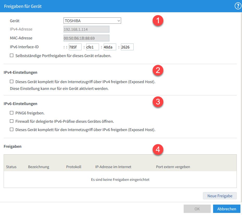 Um nun eine Portfreigabe für das Gerät einzurichten, klicken Sie unten auf den Button „Neue Freigabe“.