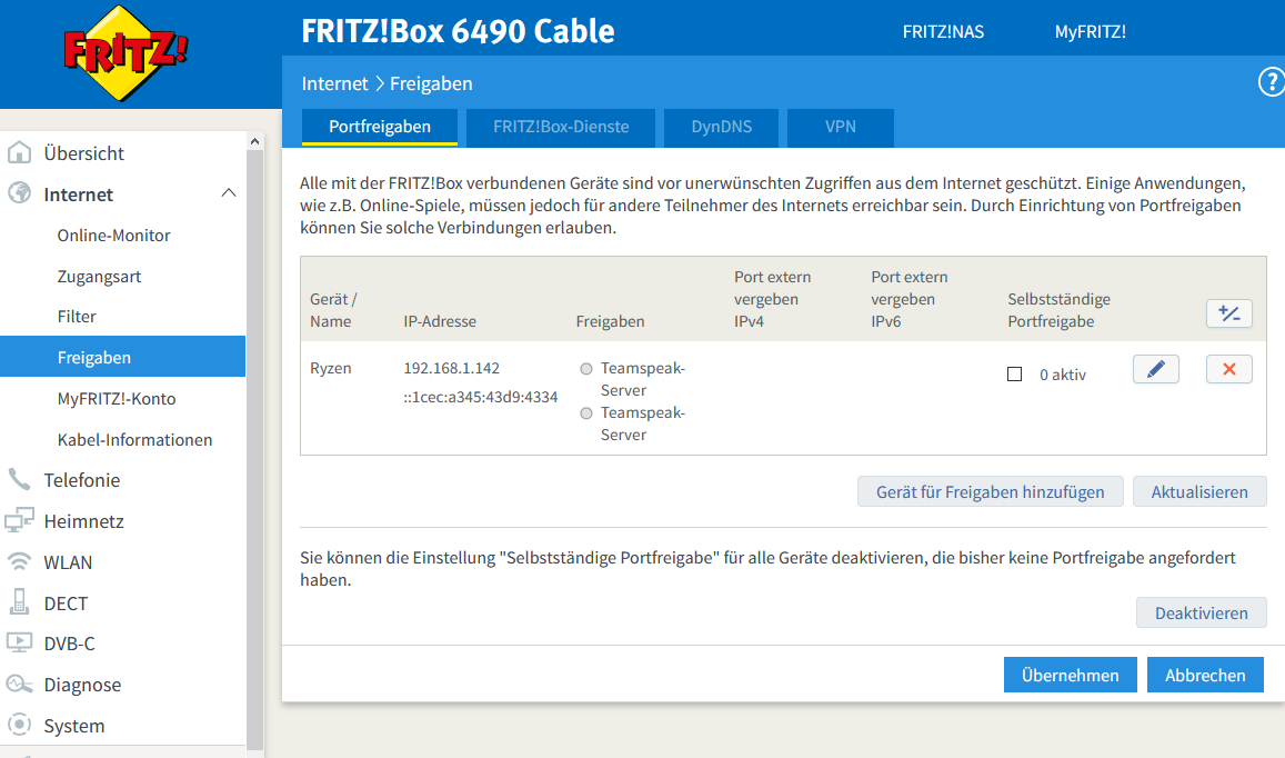 So lange Sie einen Serverdienst wie den im Beispiel verwendeten Teamspeak-Server nur im lokalen Netz betreiben, brauchen Sie keine Änderungen am Router vorzunehmen. Häufig ist es aber so, dass die lokalen Serverdienste auch von außen erreicht werden sollen oder Spiele ganz bestimmte Portfreigaben am Router benötigen, damit die Spiele beispielsweise Matchmaking mit anderen Usern über das Internet erlauben.
