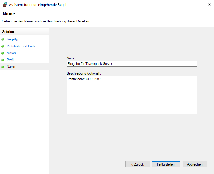 Der Teamspeak-Server aus unserem Beispiel benötigt beispielsweise den Port 9987 UDP. Klicken Sie nach der Eingabe auf „Weiter“.