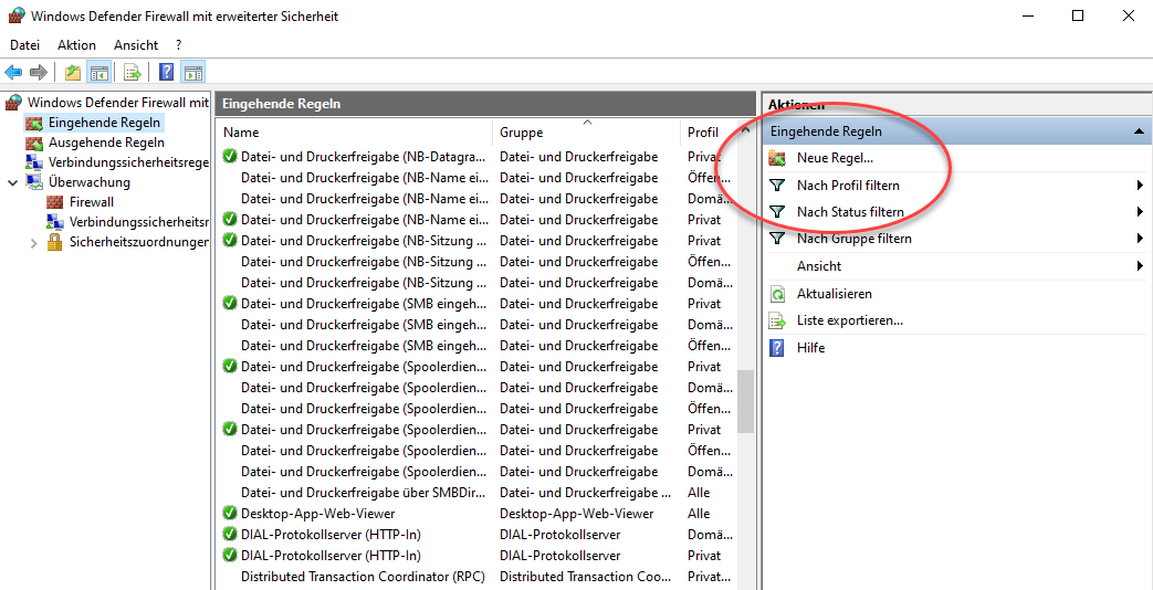 Klicken sie dann in den erweiterten Einstellungen der Firewall auf „eingehende Regeln“ und dort auf „Neue Regel“.