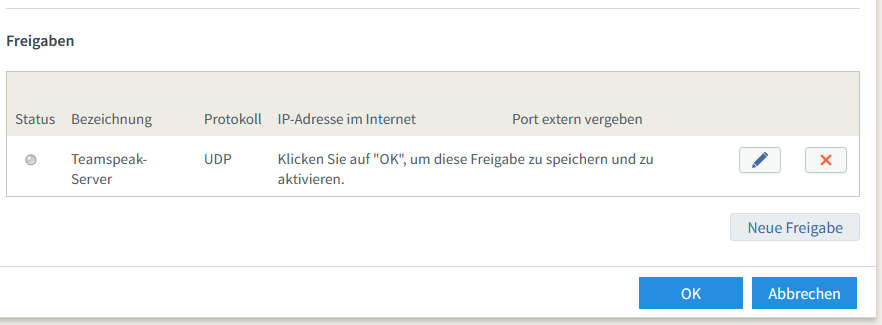 Mit einem Klick auf „OK“ wird die Portfreigabe dann aktiv und in die Liste der Portfreigaben übernommen.