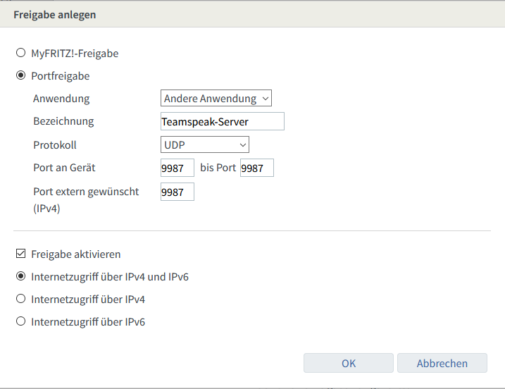 In unserem Fall wählen wir für den TeamSpeak-Server „andere Anwendung“ und geben das Protokoll mit UDP sowie den Port 9987 an.