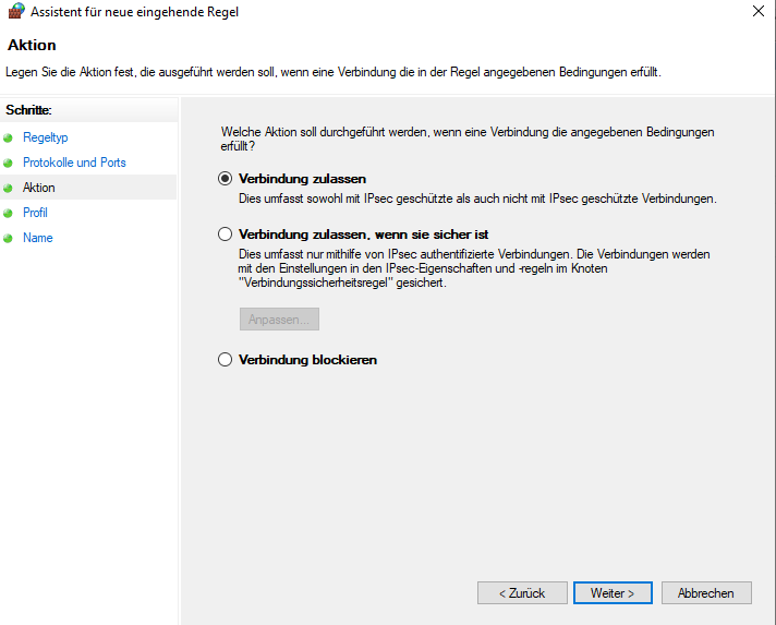 Der Assistent für die Filterregel benötigt als nächstes eine Aktion, in dem Fall die „Verbindung zulassen“.