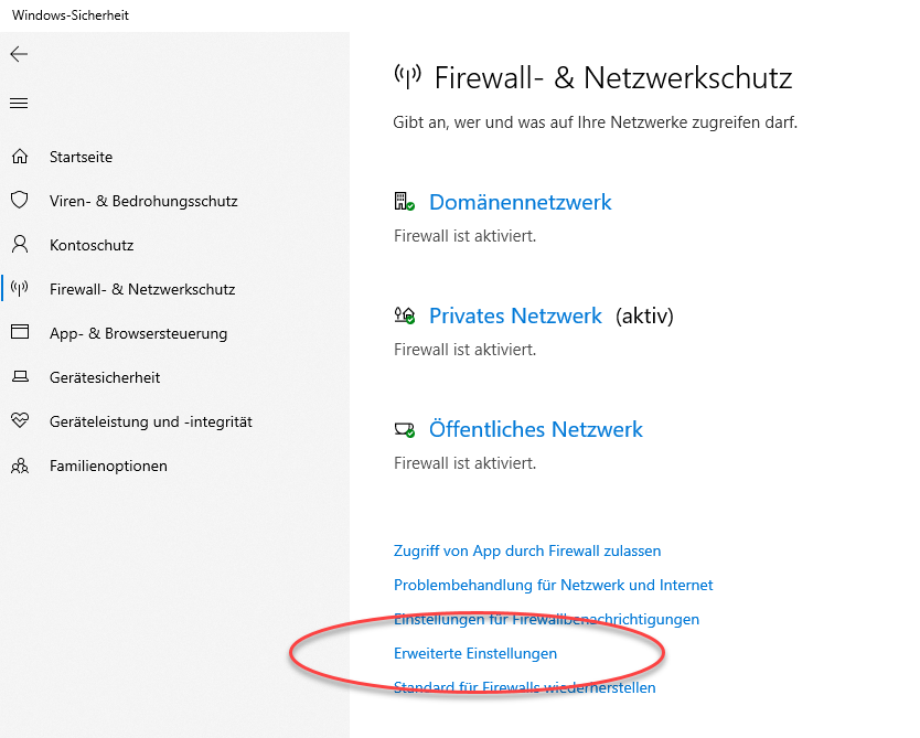 Sie können in der Liste aber nicht sehen, was genau durch die Firewall freigegeben wurde. Sie müssen daher für die genauere Analyse in den Einstellungen unter „Windows-Sicherheit“ -> „Firewall & Netzwerkschutz“ -> „Erweiterte Einstellungen“ anklicken.