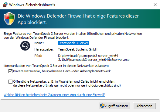 Versucht nun eine Anwendung, in unserem Beispiel der Teamspeak-Server, einen Server-Port zu öffnen, wird dies von der Windows-Firewall blockiert.