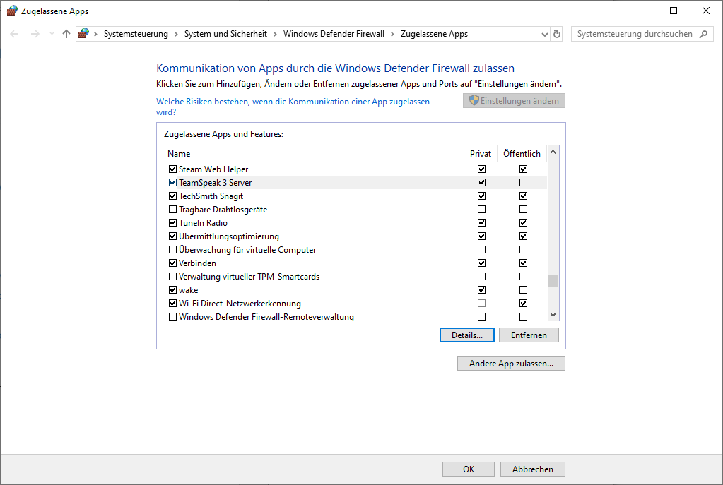 Wenn Sie oben auf „Einstellungen ändern“ klicken, können Sie Einträge in der Liste markieren und dann auch entfernen. Dadurch entfernt Windows selbstständig die Einträge für das Programm in der Windows-Firewall.