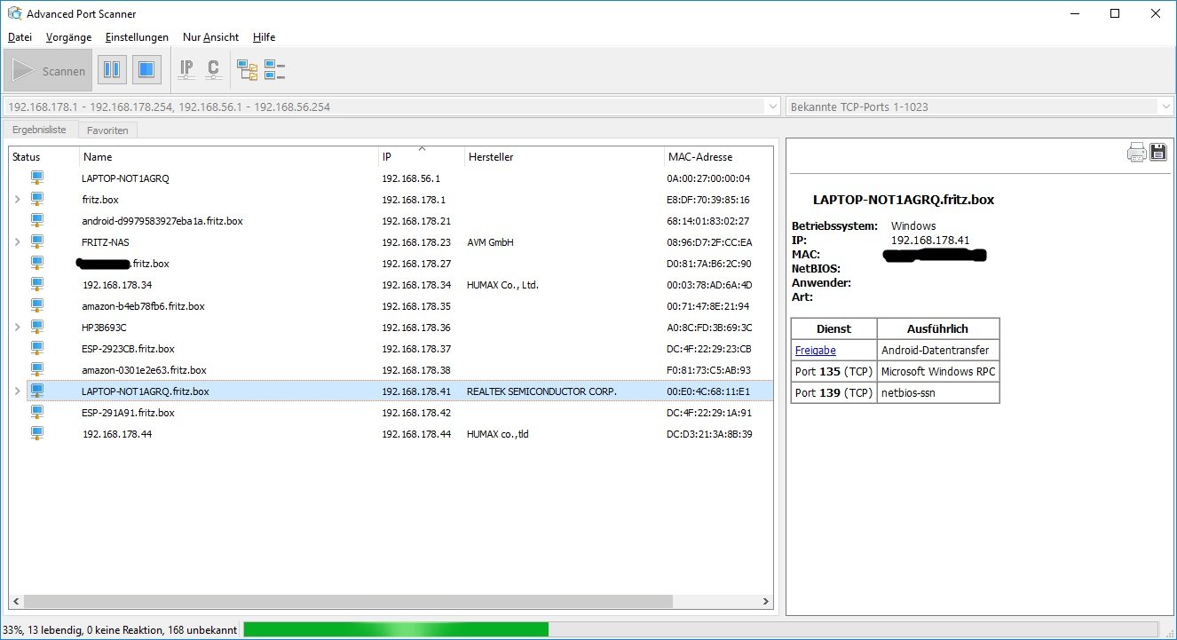 Der Advanced Port Scanner ist ein kostenloser Sniffer, der alle in einem vorgegebenen IP-Range gefundenen Netzwerkgeräte auflistet und deren Portbereiche (offene oder geschlossene Ports) anzeigt. Standardmäßig untersucht das Tool nur bekannte TCP-Ports, Sie können Einstellungen aber jederzeit anpassen und so auch alle anderen Ports testen.