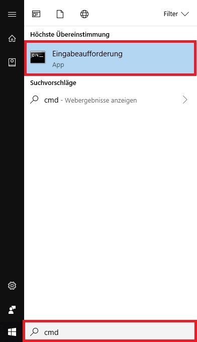 Geben Sie dazu bei unter Windows 10 „cmd“ in die Suchleiste des Desktop ein und öffnen Sie die Eingabeaufforderung mit „Rechtsklick -> Als Administrator“ ausführen (Alternativ können Sie auch über Windows-Taste + R eine Befehlszeile aufrufen).