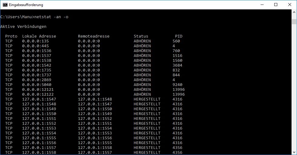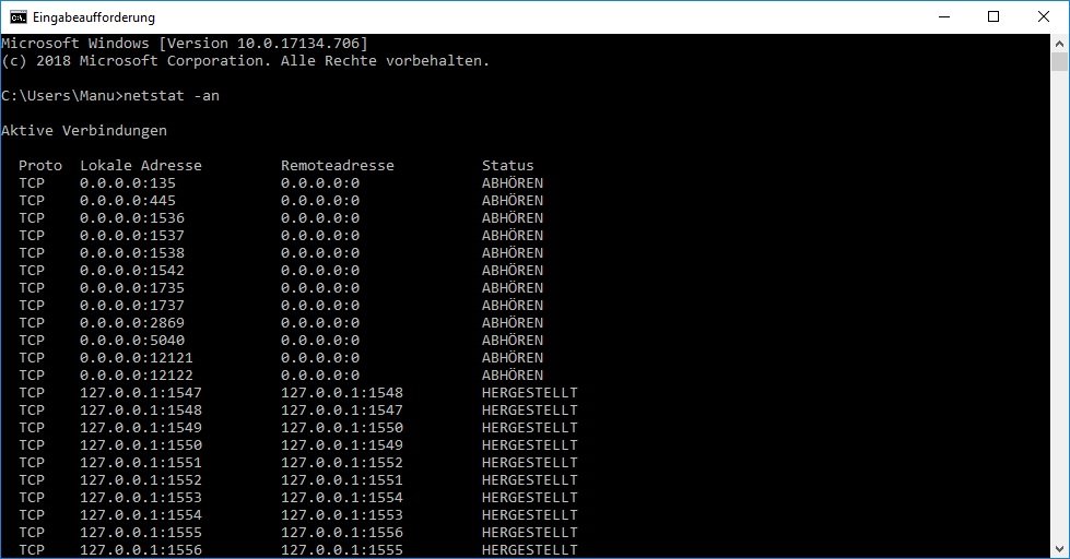 Es öffnet sich eine DOS-Box in die Sie nun den Befehl netstat -an eintippen. Sie erhalten nun eine Auflistung aller Netzwerkverbindungen Ihres Computers. Offene Ports werden mit „ABHÖREN“ (bzw. „LISTEN“ oder „LISTENING“ bei englischsprachigen Versionen) gekennzeichnet, wenn derzeit keine Verbindung besteht. Der Eintrag „HERGESTELLT“ bezeichnet hingegen eine bestehende Verbindung mit einem Serverdienst.