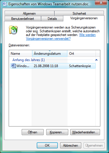 Wenn Sie Vista Ultimate, Business oder Enterprise einsetzen und mehr über das Feature „Vorgängerversionen“ erfahren möchten, geben Sie in der Windows-Hilfe als Suchbegriff „Vorgängerversionen“ oder auch „Schattenkopien“ ein.