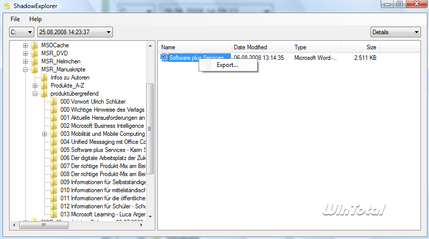 Der Vorteil bei diesem Programm lässt sich einfach erklären: Sie müssen nicht das ganze System über einen Wiederherstellungspunkt zurücksetzen, sondern können einfach und gezielt frühere Versionen einzelner Dateien und ganzer Ordner wiederherstellen, und zwar entweder am ursprünglichen Speicherort oder an einem von Ihnen ausgewählten Speicherort. Auch versehentlich gelöschte oder überschriebene Dateien oder Ordner können wiederhergestellt werden. Sie wählen in einem Drop-down-Menü den Zeitpunkt aus, klicken mit der rechten Maustaste auf die wiederherzustellende Datei und wählen „Export“.