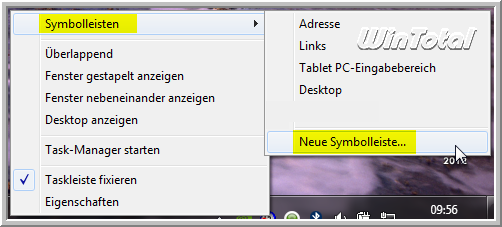 Klicken Sie dazu in der Taskleiste mit der rechten Maustaste, um das Kontextmenü anzuzeigen, und hier auf »Symbolleisten -> Neue Symbolleiste…«.