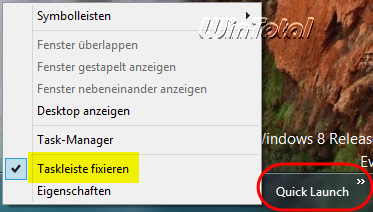 Sie finden nun in der Taskleiste einen Eintrag „Quick Launch„. Für die restliche Optimierung müssen Sie die Option Taskleiste fixieren deaktivieren (so dass das Häkchen verschwindet).