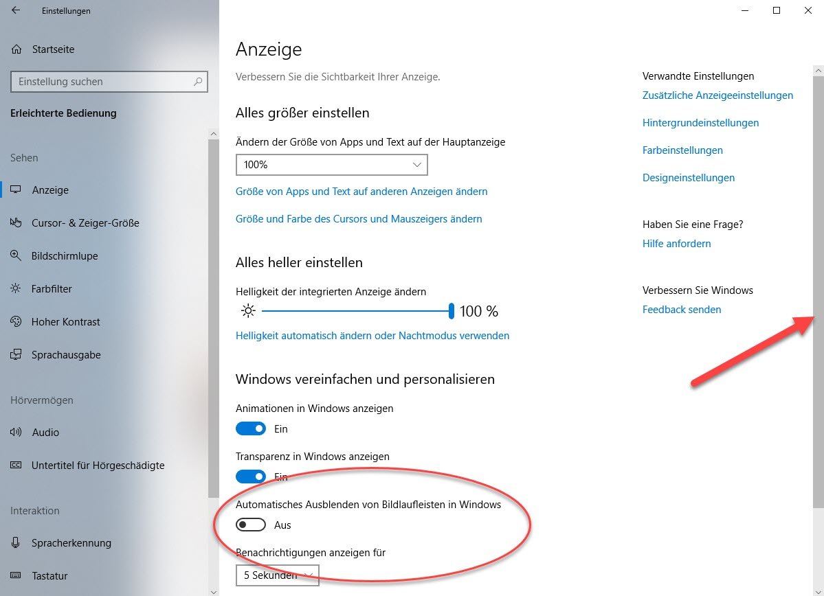 Dazu navigieren Sie in den Abschnitt „Erleichterte Bedienung“ und hier unter „Anzeige“. Der Punkt „Automatisches Ausblenden von Bildlaufleisten in Windows“ kann deaktiviert werden. Im Ergebnis sehen Sie dann sofort die Bildlaufleisten in den Einstellungen und anderen Apps von Windows 10.