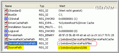 Ist kein Service Pack installiert, wird der Speicherort zum i386-Ordner unter SourcePath im gleichen Registryzweig eingetragen.
