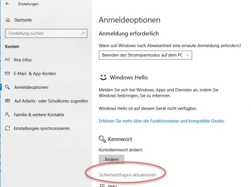 Windows 10 bietet in neueren Versionen die Möglichkeit, zu dem Benutzer-Kennwort auch Sicherheitsfragen und passende Antworten zu hinterlegen für den Fall, dass einem das Kennwort entfällt.