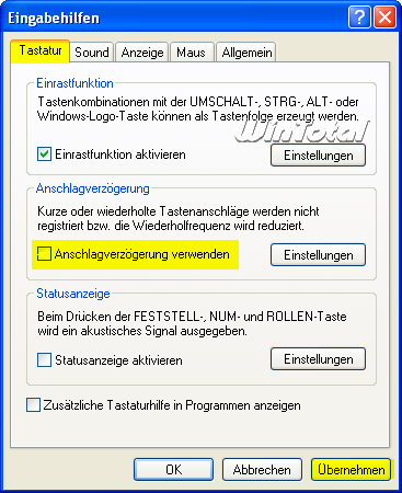 Systemsteuerung – Eingabehilfen – Registerkarte „Tastatur“