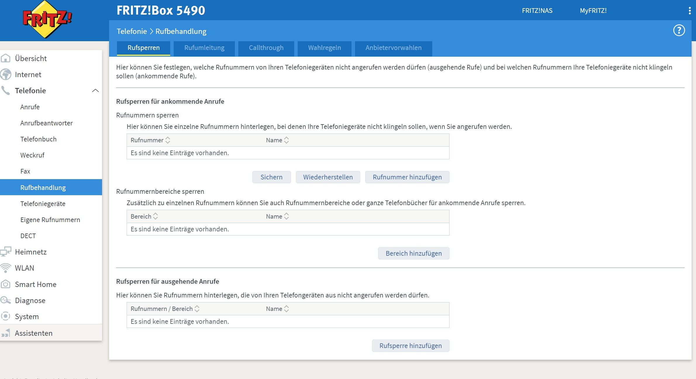 - Im Reiter „Rufsperren“ können Sie einzelne Telefonnummern sperren, Bereiche blockieren oder Rufsperren für ausgehende Anrufe festlegen.