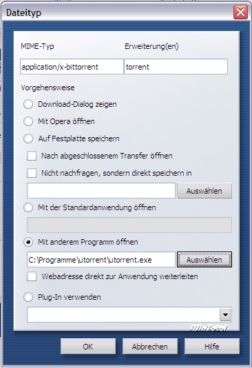 Nun einen Punkt bei „Mit anderem Programm öffnen“ und dort den Pfad zum Filesharing-Client angeben, an den die Torrent-Datei übergeben werden soll.