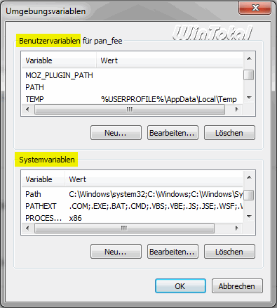 | PATH | Verzeichnisse, in denen nach Befehlen gesucht wird | Die Verzeichnisse werden durch ein ; getrennt (siehe Screenshot oben) |