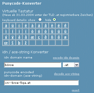 Bisher durften im Internet nur ASCII-Zeichen (American Standard Code for Information Interchange) verwendet werden, also nur die lateinischen Buchstaben a bis z, die arabischen Zahlen 0 bis 9 und der Bindestrich. Nun beschloss die „Internet Engeneering Task Force“ die mögliche Zeichenzusammensetzung von Domains, um landesspezifische Zeichen zu erweitern – den IDN (Internationalized Domain Name). Das heißt, es bekommen Länder individuelle Schreibweisen in ihre Internetadressen: die Araber ihre Symbole, die Chinesen ihre Zeichen und wir die Umlaute oder Sonderzeichen im Web-Domains – als Beispiel http://www.börse.de