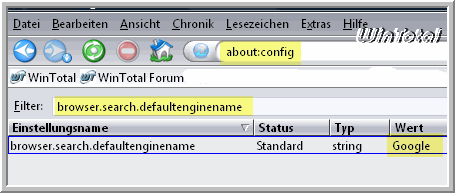 Im Filter: browser.search.defaultenginename kann die Suchmaschine zurückgesetzt werden – Wert = Google oder Bing