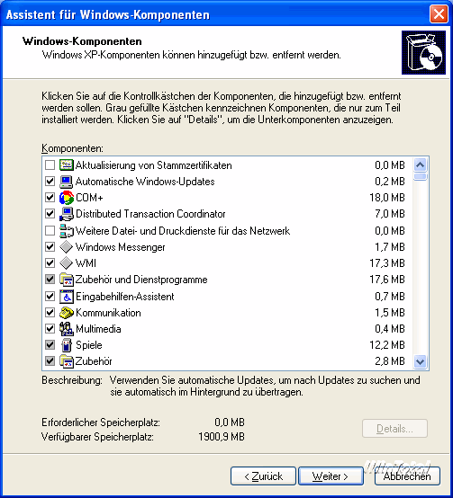 Windows XP bietet bei der Installation und auch später in der Systemsteuerung unter „Software“ keine Möglichkeit, ungewünschte Komponenten aus dem System zu entfernen. Wenn man in der Datei sysoc.inf auf dem Windows-Laufwerk aber alle hide-Texte durch Leerzeichen ersetzt, kann man auf einmal wesentlich mehr Software-Komponenten entfernen.