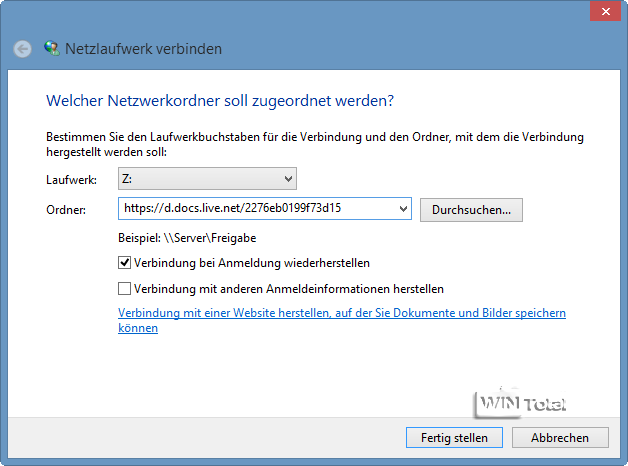 Aktivieren Sie noch „Verbindung bei Anmeldung wiederherstellen“ und klicken Sie dann auf die Schaltfläche „Fertig stellen“.