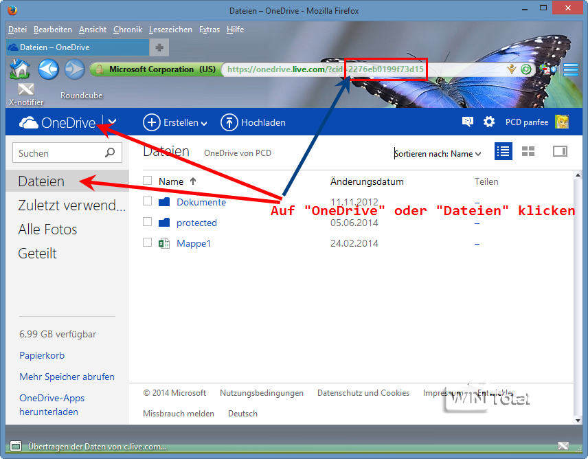 Zuerst brauchen Sie die ID-Nummer von OneDrive. Loggen Sie sich online bei OneDrive ein. In OneDrive klicken Sie auf „Dateien“ oder oben links auf das OneDrive-Logo. In der Adressleiste des Browsers erscheint nun eine cid-Nummer, das ist Ihre ID-Nummer. Schreiben Sie sich die Nummer nach ?cid= auf. In diesem Beispiel: 2276eb0199f73d15
