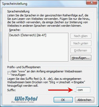 Menü „Extras“ – Internetoptionen – Allgemein – Button Sprachen – unter „Suffix“.