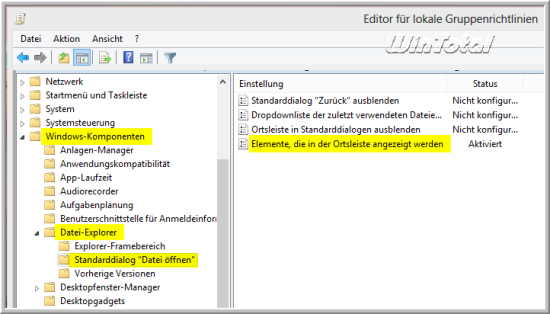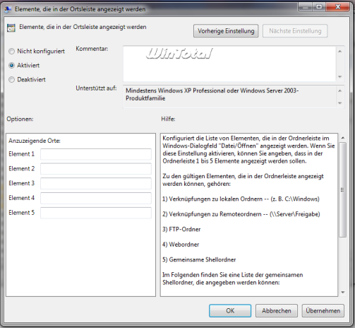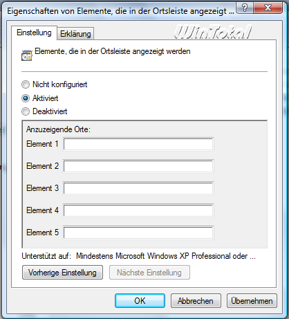Hinweis: Unter Windows Vista gilt diese Richtlinieneinstellung nur für Anwendungen, die den Windows XP-Stil für allgemeine Dialogfelder verwenden. Diese Richtlinieneinstellung gilt nicht für den neuen Windows Vista-Stil für allgemeine Dialogfelder.