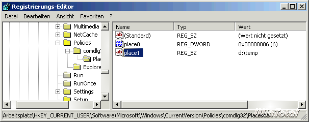 z.B.: place[Nummer] – REG_DWORD – 0x00000006 (für Favoriten)