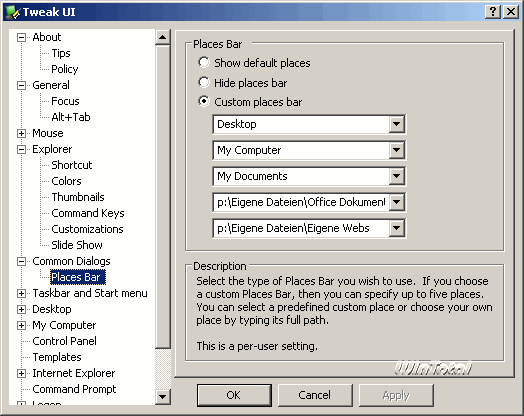 Mit Tweak UI 2.10 speziell für Windows XP kann man die Places auch komfortabel einstellen.