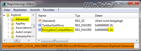 einen neuen DWORD-Schlüssel mit dem Namen EncryptionContextMenu und dem Wert 1.