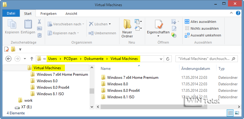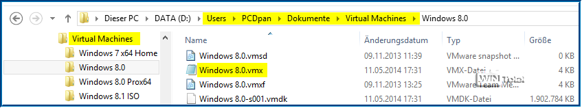 Öffnen Sie z.B. den Ordner Windows 8.x – hier finden Sie die VMX-Datei, die evtl. Windows 8.0.vmx lauten kann.
