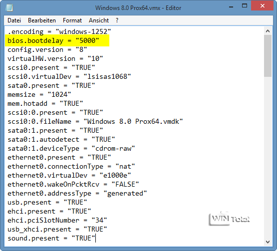 Klicken Sie diese VMX-Datei rechts an, dann auf „Bearbeiten„. Die VMX-Datei öffnet sich nun im Notepad und hier tragen Sie einfach bios.bootdelay „5000“ (für 5 Sekunden) oder „10000“ (für 10 Sekunden) ein. Danach schliessen Sie Notepad über das rote Schliessen-Kreuz und klicken auf „Speichern“ (siehe 1.Screenshot).