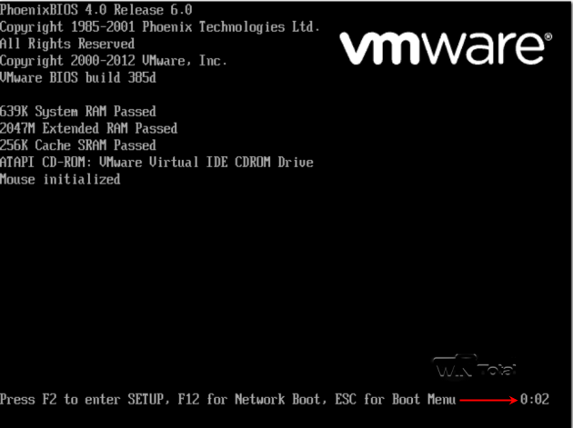 Die virtuellen Maschinen in VMWare-Produkten emulieren auch ein BIOS. Die BIOS-Meldungen und Möglichkeiten für ein Bootmenü mit [ESC] oder [F2] für das Setup sind aber nur für eine sehr kurze Zeitspanne verfügbar und werden oft verpasst.