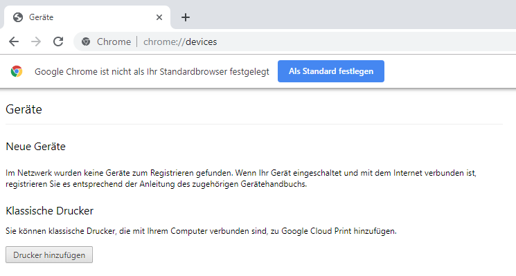 Um einen Drucker mit Google Cloud Print zu verbinden, benötigen Sie den Webbrowser Google Chrome. Geben Sie hier in die Adressleiste Chrome://devices ein, um Ihren Drucker zum Google Cloud Print hinzuzufügen. Sie können hier sogar einen Drucker verwenden, welcher im Grunde nicht direkt Google Cloud Print unterstützt, muss aber über WLAN oder LAN erreichbar sein. Ein USB-Drucker funktioniert daher mit Cloud Print nicht.
