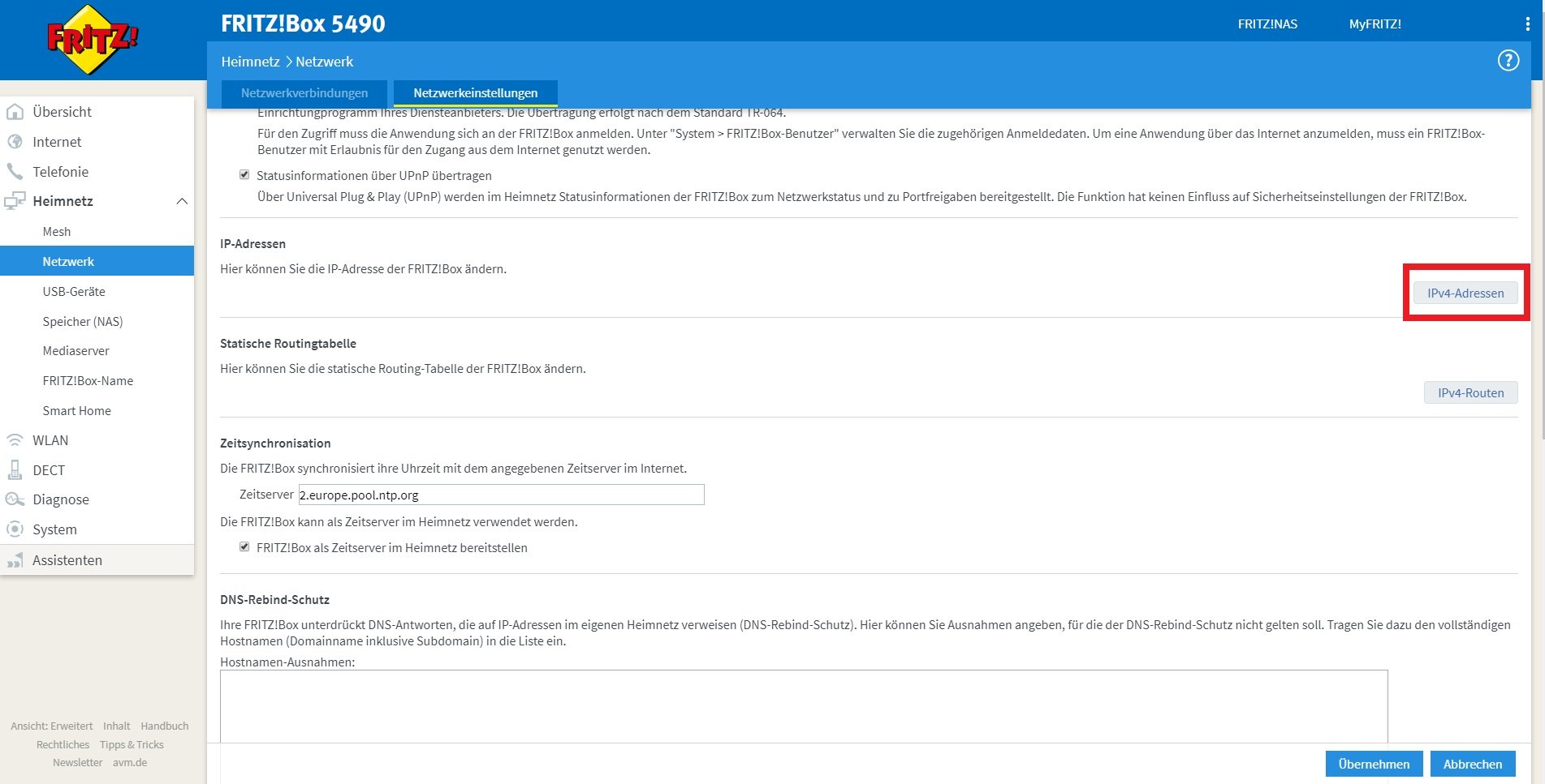 - Gehen Sie zu „Heimnetz -> Netzwerk -> Netzwerkeinstellungen“ und klicken Sie dort auf den Button „IPv4-Adressen“. Sollte Ihr Netzwerk bereits IPv6fähig sein, ist der Button entsprechend anders benannt.