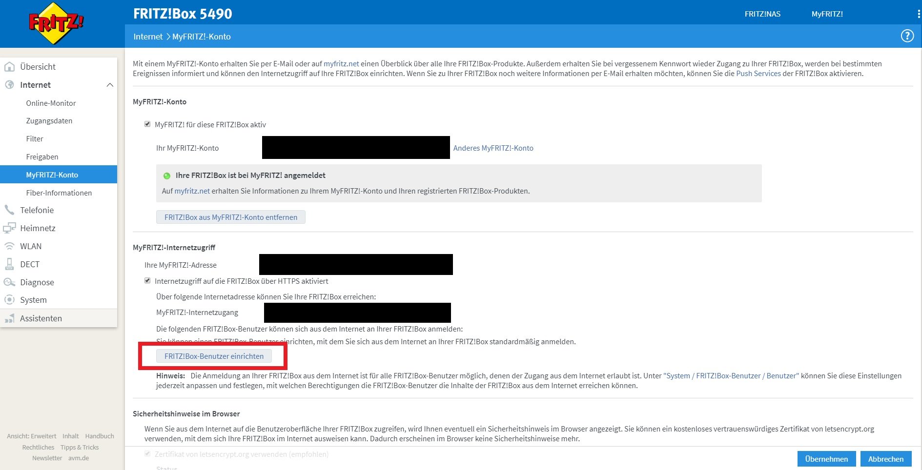 - Falls Sie noch kein MyFRITZ!-Konto angelegt haben, gehen Sie auf „Internet -> MyFRITZ!Konto“ und richten Sie dort ein neues Konto ein.