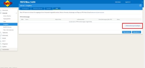 - Rufen Sie die Benutzeroberfläche Ihrer Fritzbox über den Browser auf und gehen Sie unter „Internet -> Freigaben“ auf die Registerkarte „VPN“.
