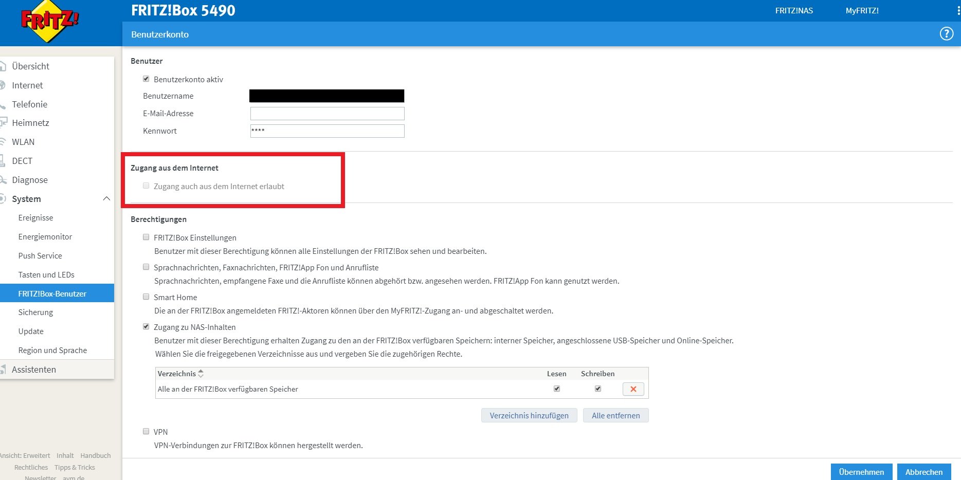 - Setzen Sie das Häkchen bei den Optionen „Zugang auch aus dem Internet erlauben“ und „VPN“. Tragen Sie ferner eine Email-Adresse ein bzw. lassen Sie die bestehende unverändert und bestätigen Sie Ihre Eingaben mit „Übernehmen“.