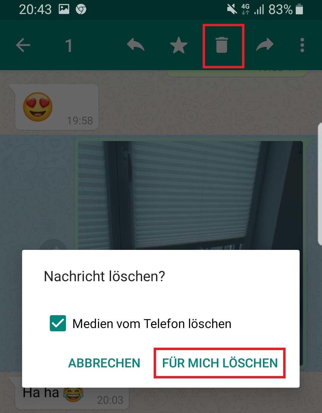 - Wählen Sie nun das Papierkorb-Symbol Setzen Sie anschließend das Häkchen bei „Medien vom Telefon löschen“ und bestätigen Sie mit „Für mich löschen“.