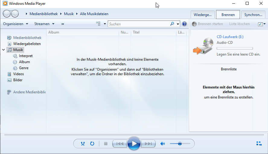 Wenn Sie eine Audio-CD aus vorhandener Digitalmusik wie MP4 oder MP3 erstellen möchten, bietet Windows mit dem Windows Media Player ein passendes Werkzeug. Sie können den alten Windows Media Player zum Rippen einer Audio-CD und zur Erstellung einer neuen Audio-CD verwenden. Dazu starten Sie den Windows Media Player und klicken dann auf den rechten Button „Brennen“.