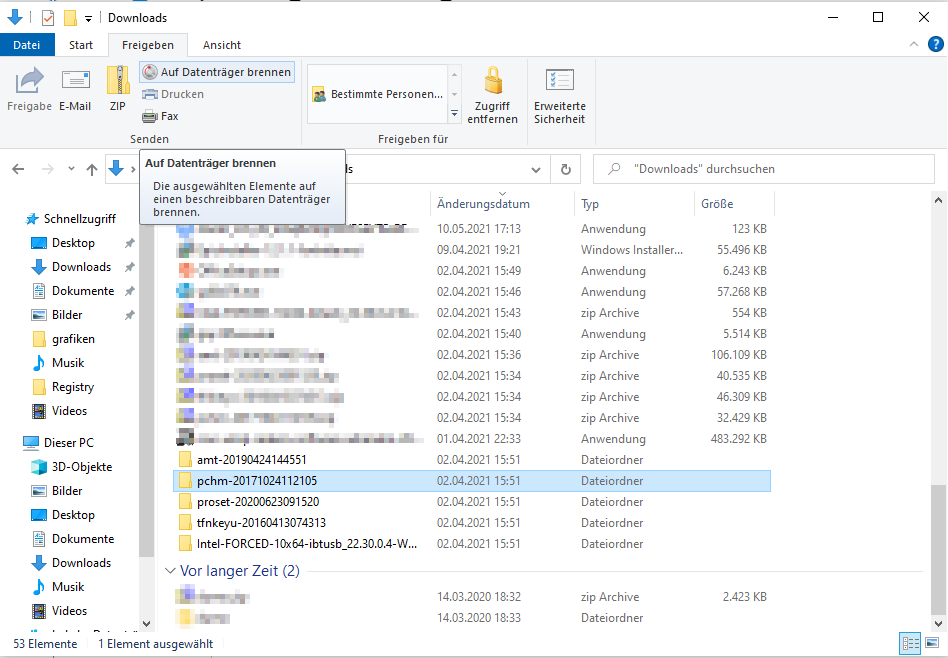 Der erste Zugang findet sich über den Windows-Explorer. Wenn Sie einen Ordner oder eine Datei selektiert haben, finden Sie in der Menüleiste vom Explorer im Abschnitt „Freigeben“ die Funktion „Auf Datenträger brennen“.