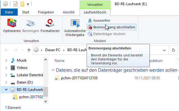 Wenn Sie sich für eine Variante entschieden haben, werden die zu brennenden Ordner und Dateien in einen Ordner kopiert, dessen Inhalt auf den Datenträger gebrannt werden soll. Um den Brennvorgang zu starten, müssen Sie unter dem Menüeintrag Laufwerktools noch den „Brennvorgang abschließen“.