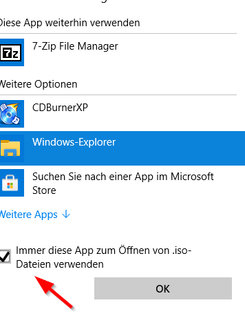 In dem folgenden Dialog wählen Sie den Windows-Explorer als Standard-App aus, indem Sie die Checkbox „Immer diese App…“ auswählen.